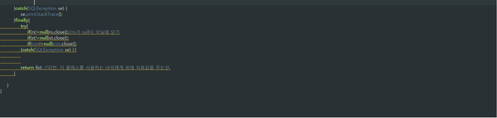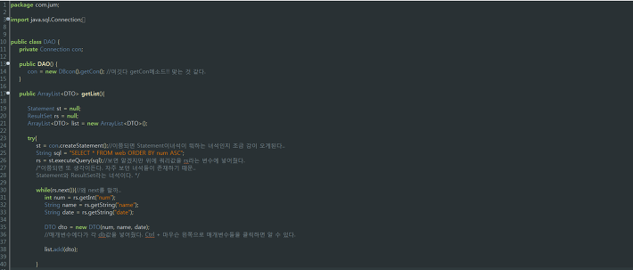보기 헷갈리지만 두개 소스는 같은 곳에 있는 소스이다.. 다만 스샷찍다가 한번에 안찍혀서 이렇게 찍은 거니까.. 걍 쭉 작성하면 된다. 보면 알겠지만 디비를 연결했으니, 디비를 사용하기 위해, DAO클래스를 만든 것이다.