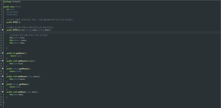 DTO = DB의 자료저장. 그니까 DB데이터를 리턴해주고 생성해주는 곳이라 생각하면됨.