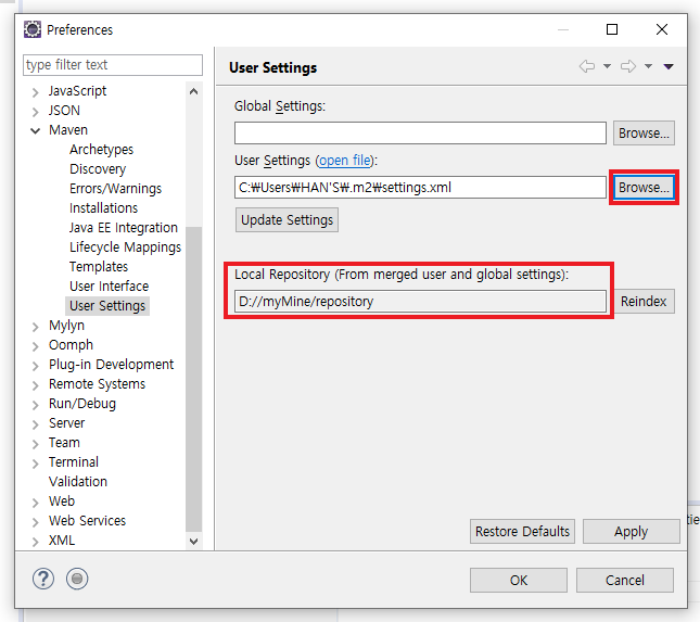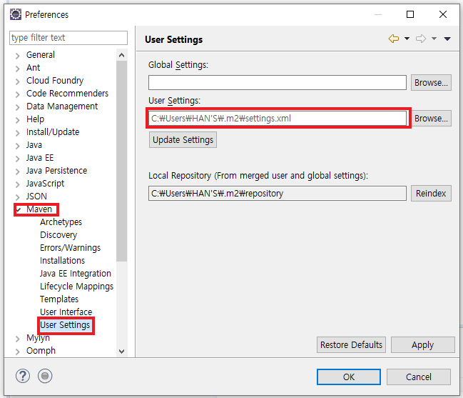 - 이클립스 maven repository 사용자 경로 설정하기 -