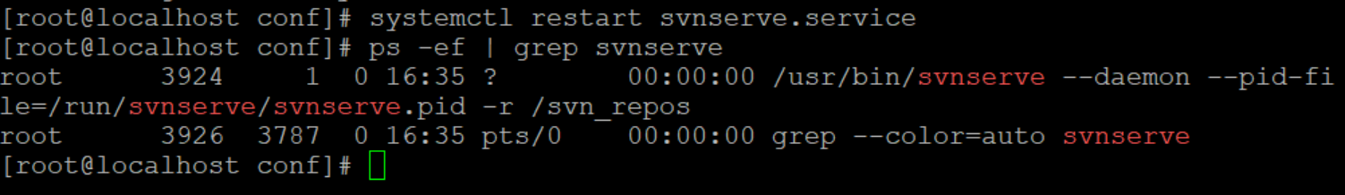 | [root@localhost ~]# systemctl start svnserve.service [root@localhost ~]# ps -ef | grep svn root 8827 1 0 19:28 ? 00:00:00 /usr/bin/svnserve --daemon --pid-file=/run/svnserve/svnserve.pid -r /svn_repos root 9373 7879 0 19:28 pts/2 00:00:00 grep --color=auto svn [root@localhost ~]# netstat -anp | grep svnserve tcp 0 0 0.0.0.0:3690 0.0.0.0:* LISTEN 8827/svnserve [root@localhost ~] |