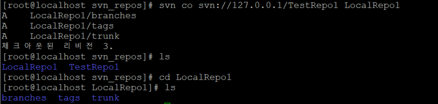 | svn co svn://ip 또는 도메인 주소/저장소명 |