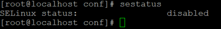 | [root@localhost conf]# vi /etc/selinux/config # This file controls the state of SELinux on the system. # SELINUX= can take one of these three values: # enforcing - SELinux security policy is enforced. # permissive - SELinux prints warnings instead of enforcing. # disabled - No SELinux policy is loaded. SELINUX=disabled # SELINUXTYPE= can take one of three two values: # targeted - Targeted processes are protected, # minimum - Modification of targeted policy. Only selected processes are protected. # mls - Multi Level Security protection. SELINUXTYPE=targeted |