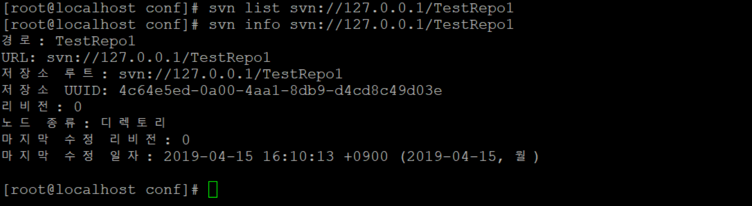 | svn list svn://ip 또는 도메인 주소/저장소명 svn info svn://ip 또는 도메인 주소/저장소명 |
