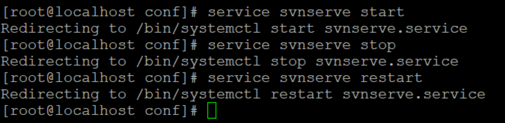 | systemctl start svnserve.service #실행 systemctl stop svnserve.service #중지 systemctl restart svnserve.service #재실행 |