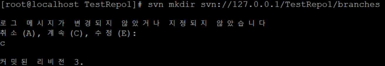 svn mkdir 명령어로 trunk, tags, branches를 각각 만듭니다.