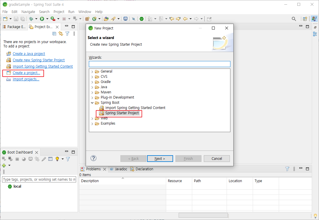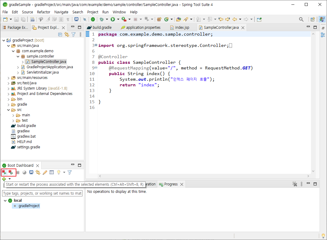 1) Boot DashBoard 에서 프로젝트 명(gradleProject) 를 선택후 Start 또는 Debug 로 서버를 실행한다.