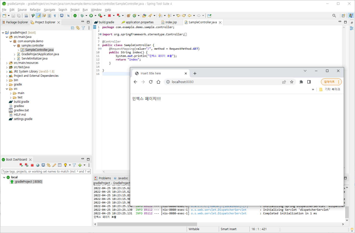 2) 브라우저 창을 연 후 http://localhost:8080 으로 접속하면 작성한 소스의 페이지가 호출되는 것을 확인할 수 있다.