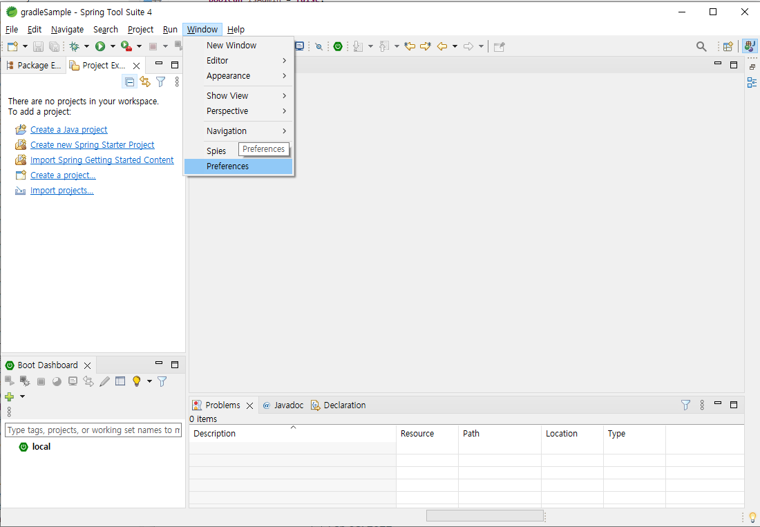 1) STS 실행후 Window -> Preferences 창을 열어준다.