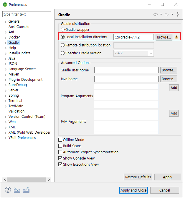 2) 좌측 메뉴에서 Gradle 을 선택, Local installation directory 에 gradle 을 수동 설치한 경로를 지정해 준다.