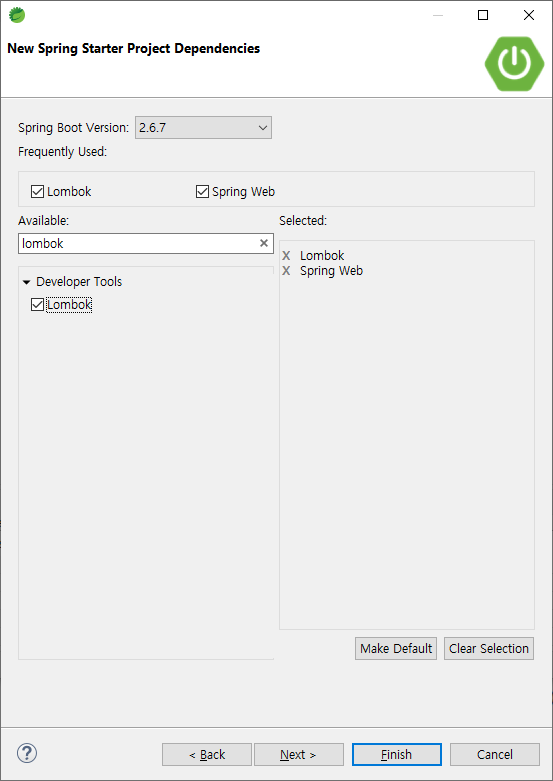 3) Dependencies 선택을 할 경우 프로젝트 생성시 최초 build.gradle 관련 라이브러리들이 자동으로 설정 된 상태로 프로젝트가 생성된다. 최초 Lombok 과 Spring Web 만 선택을 하고 필요한 라이브러리들은 추후 build.gradle 파일에서 추가하면 된다.