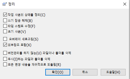 "clean up" 명령 창이 뜨면 아래와 같은 옵션들을 보실 수 있습니다(※ 편의를 위해서 한글 버전으로 출력했습니다).