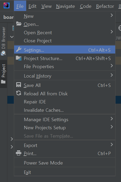 3. 상단 메뉴바 file탭의 Settings