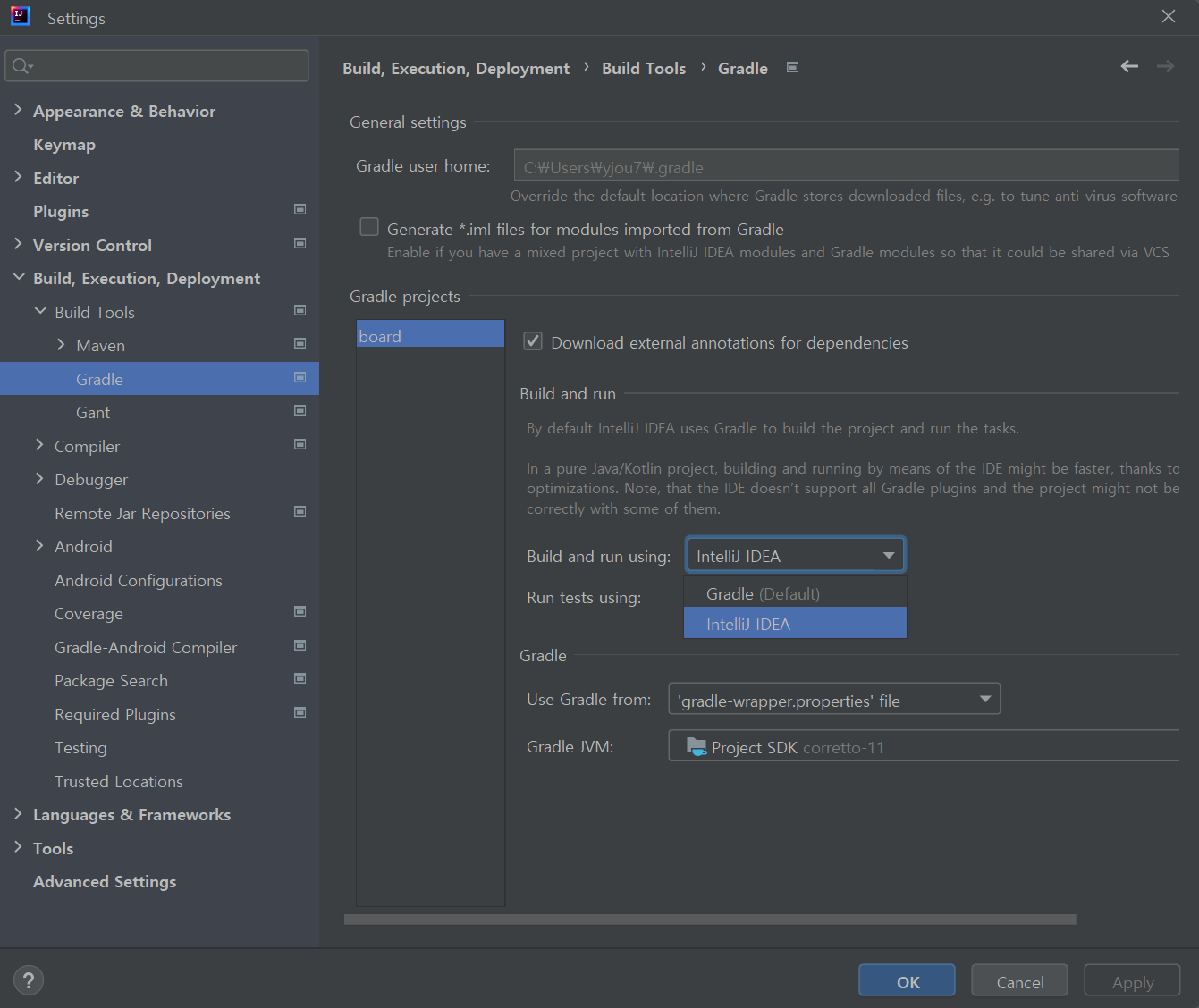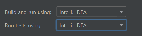 8. Build and run using 과 Run test using 두개 모두 Gradle로 되어있다면 IntelliJ IDEA로 변경한다.