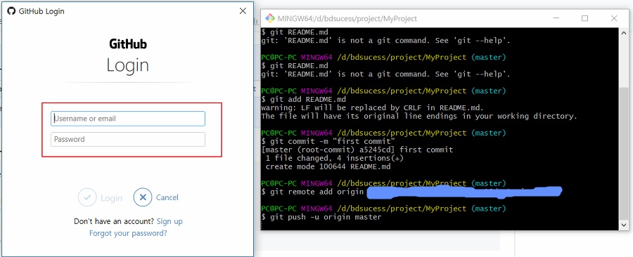 기존에 github에서 로그아웃하고
